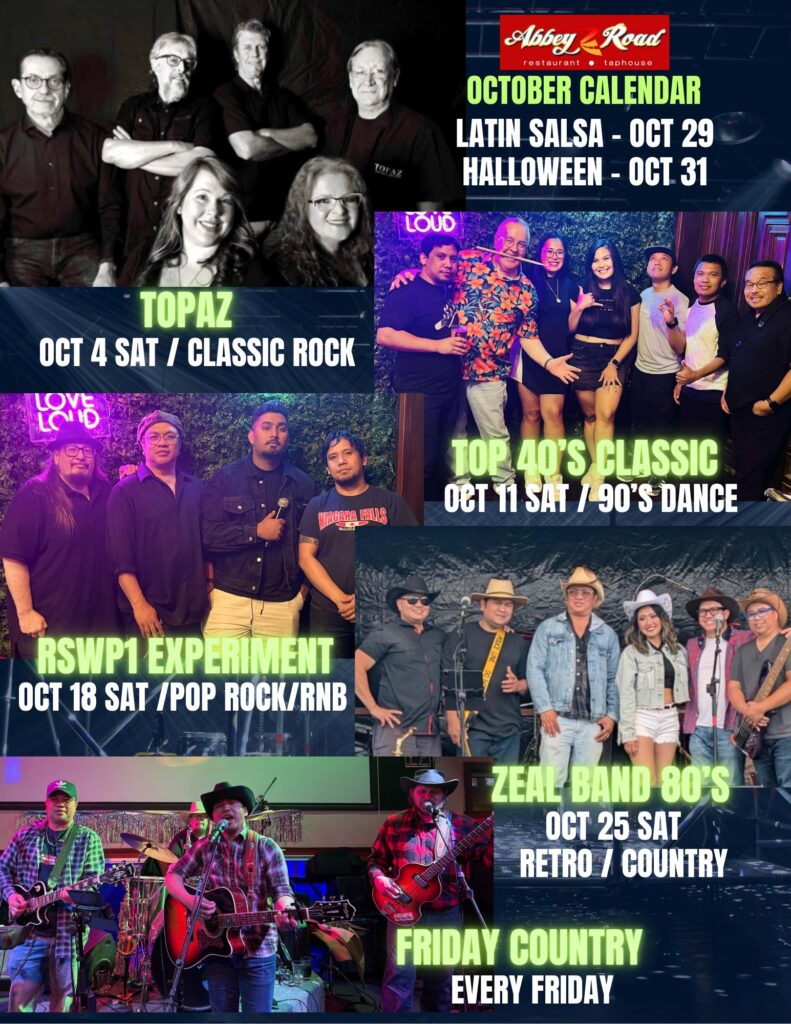 Join us at Abbey Road every Saturday and Sunday evening for live band with different genres! Call below to make a reservation.