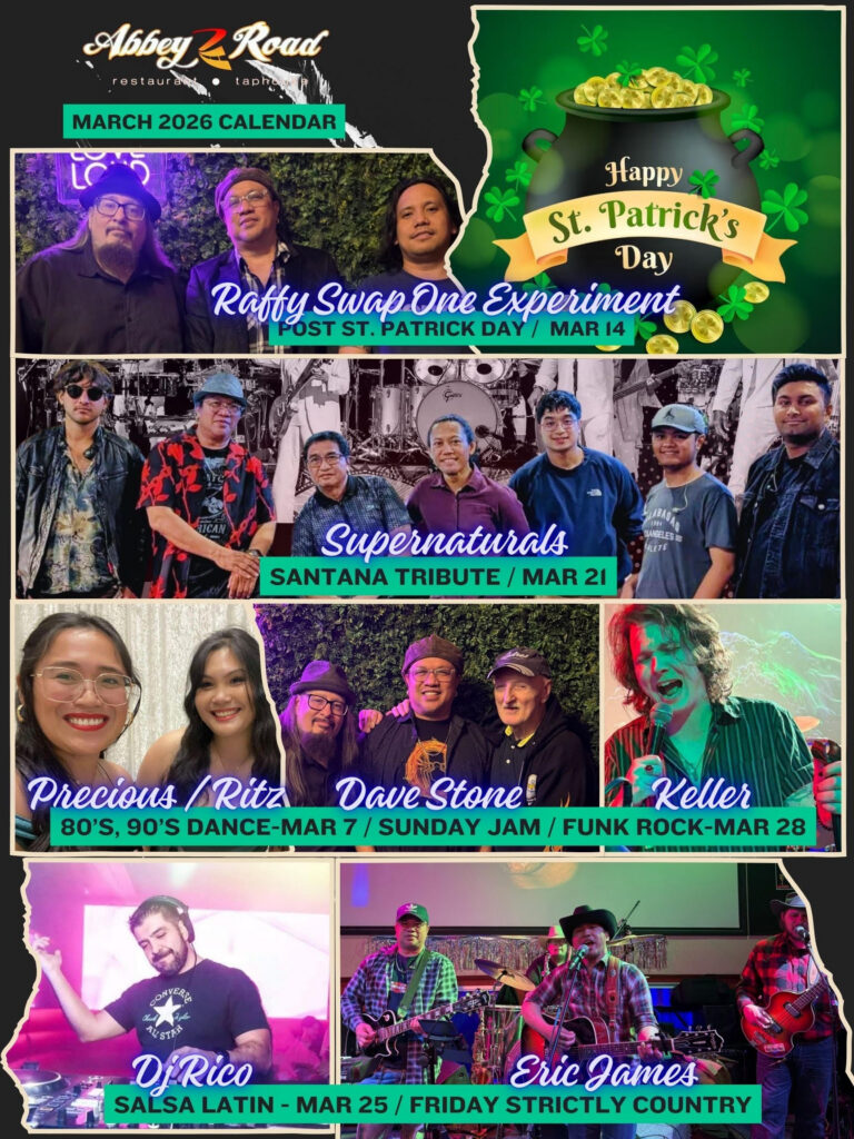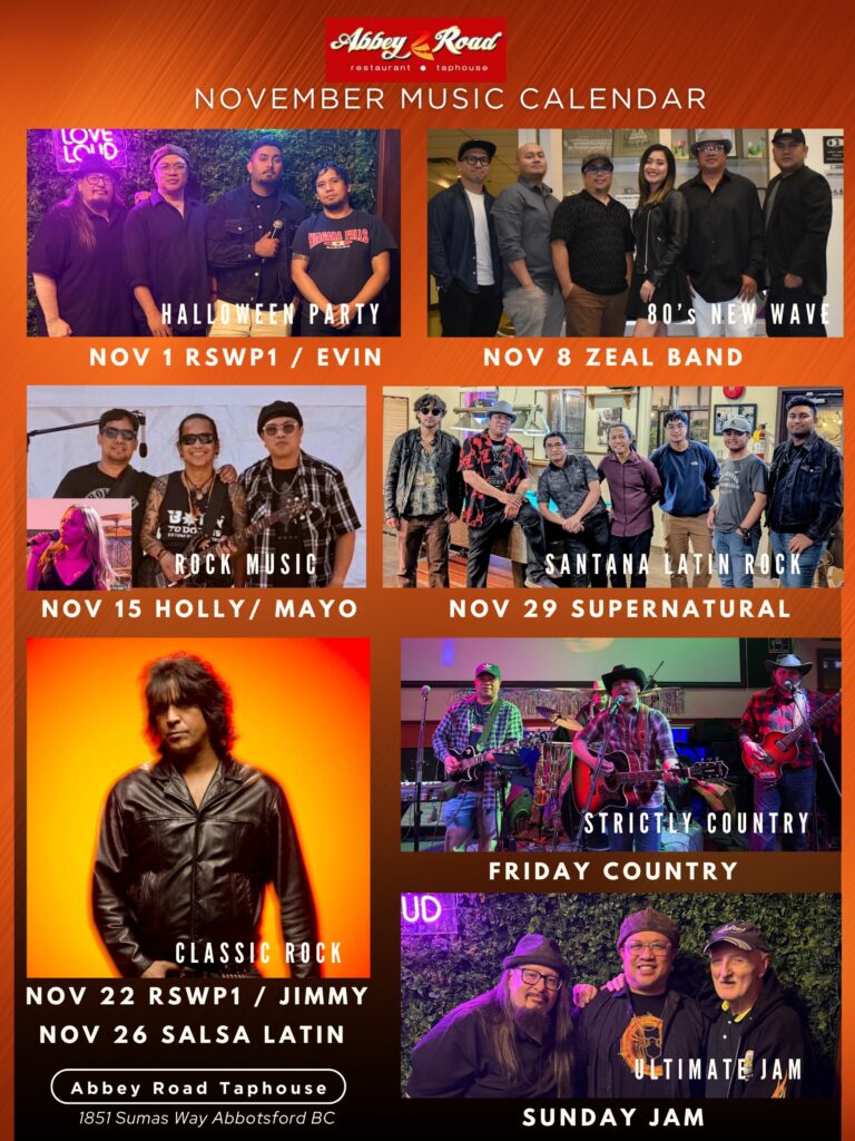 Join us at Abbey Road every Saturday and Sunday evening for live band with different genres! Call below to make a reservation.