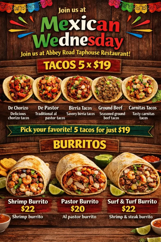 Join us at Abbey Road every last Wednesday of the month for a live DJ performance by DJ Rico! Call below to make a reservation — don’t miss out!